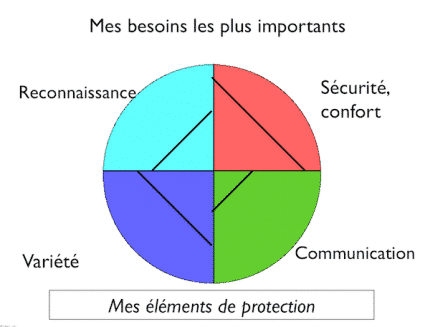 Une autre façon de procéder, c’est de choisir les 4 besoins qui sont les plus importants pour vous (vos éléments de protection). Par exemple, dans la figure que vous voyez ici, une personne choisit les besoins Reconnaissance, Confort, Variété et Communication. Choisissez les vôtres et placez les sur un cercle divisé en 4 parties.